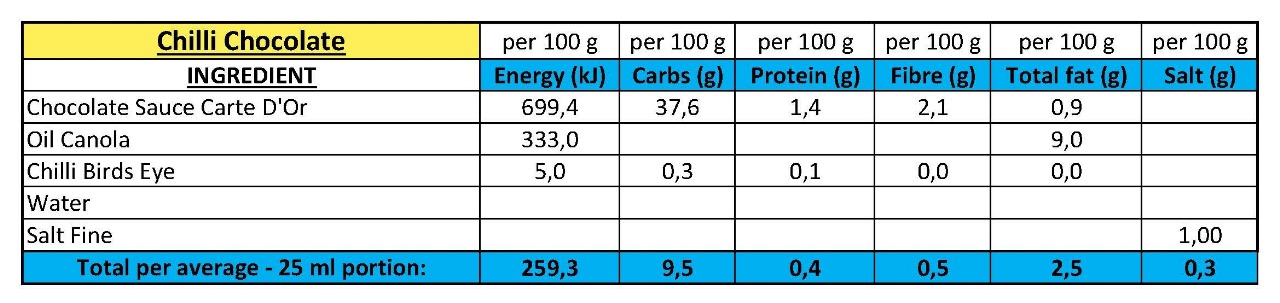 Chocolate Sauce Carte D’or, Oil Canola, Chilli Bird’s Eye, Water, Salt Fine