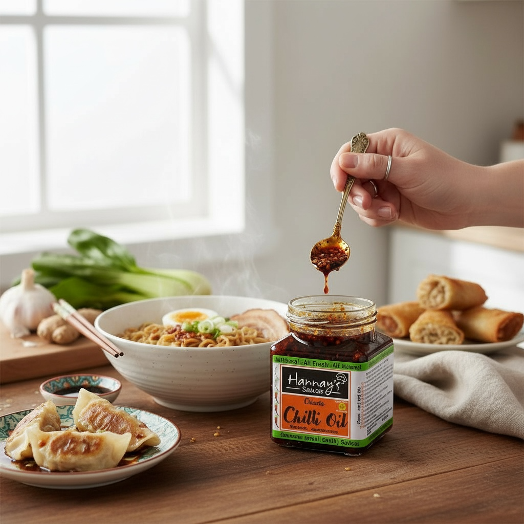 Chinese Chilli Oil, a staple in Asia for centuries and variants are just as vast. This has a unique blend of fresh herbs and aromatics that get infused together in a particular way. The versatility is endless: a dipping sauce, stews, a spicy kick to pizzas, burgers, wonton, dim sums, stir fry, ctc.
